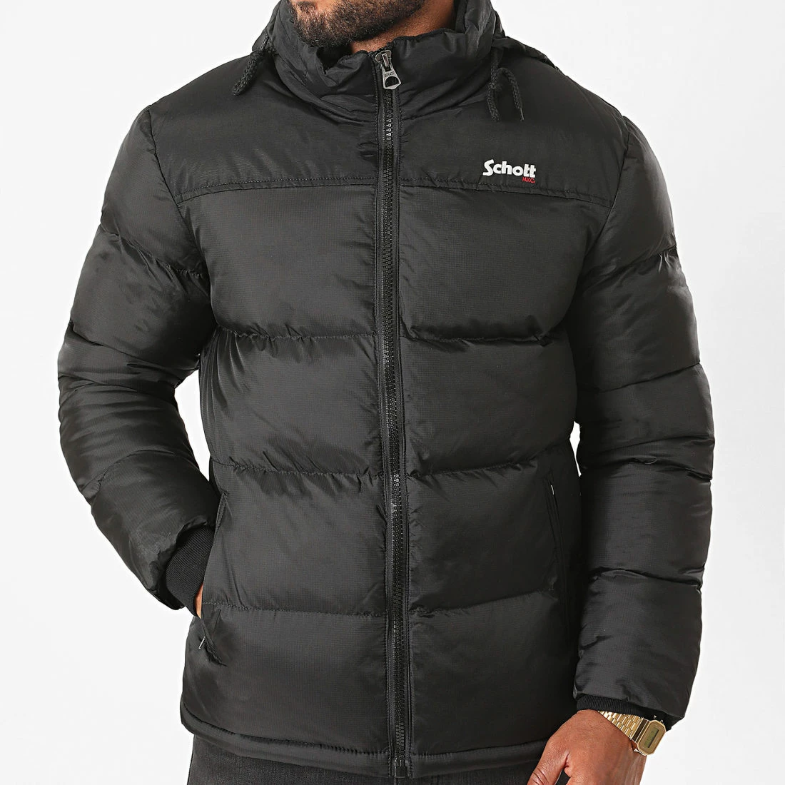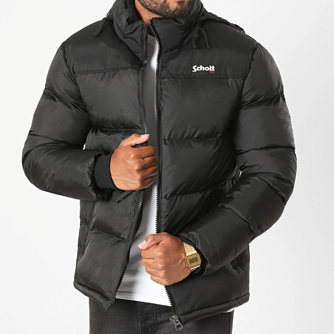 • Doudoune épaisse et matelassée à capuche avec visuel Schott brodé sur la poitrine